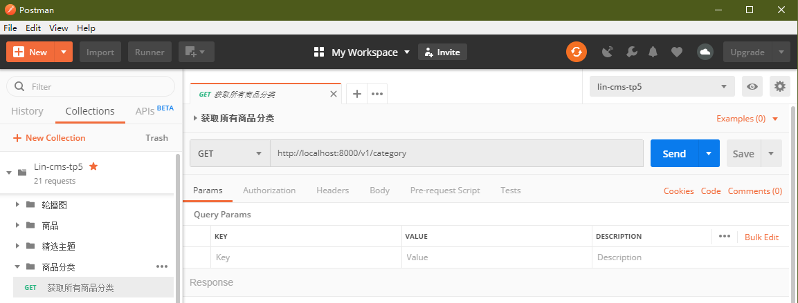 提示我们创建成功了,这时候我们调一下上节实现的查询分类接口来验证一下: